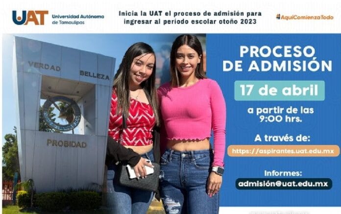 Ciudad Victoria, Tam.; 16 de abril de 2023.- La Universidad Autónoma de Tamaulipas (UAT) reanuda este lunes 17 de abril sus actividades administrativas y al mismo tiempo inicia el proceso de admisión para el período escolar de otoño 2023 en todas las dependencias académicas de esta casa de estudios distribuidas en las zonas centro, norte y sur del estado.