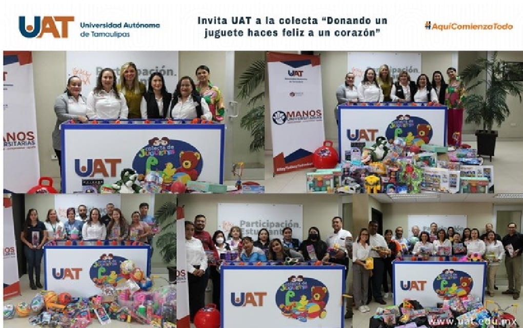Ciudad Victoria, Tam.; 23 de marzo de 2023.- La Universidad Autónoma de Tamaulipas (UAT) fomenta la participación de su comunidad estudiantil, docente y administrativa en la colecta 2023 “Donando un juguete haces feliz a un corazón”, cuyo objetivo es recabar la mayor cantidad posible de juguetes en beneficio de la niñez tamaulipeca.