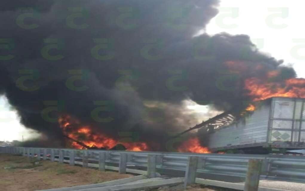 Nuevo Laredo, Tamaulipas.— Atrapado en los fierros de su camioneta, un hombre perdió la vida calcinado al chocar contra dos tráileres.
