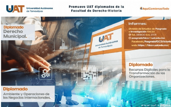Ciudad Victoria, Tam.; 26 de agosto de 2023.- La Universidad Autónoma de Tamaulipas (UAT), a través de la Facultad de Derecho y Ciencias Sociales Victoria (FDCSV), dio a conocer la apertura de tres diplomados con el propósito de ofrecer oportunidades de educación continua profesional en distintas áreas y especialidades.