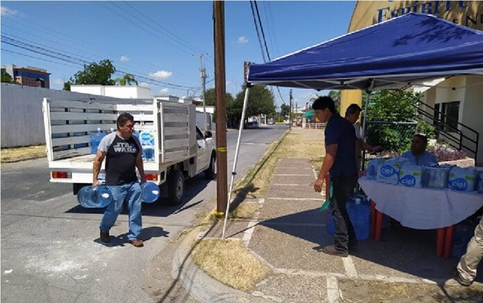 NUEVO LAREDO, TAM.- En el “golfito” ubicado en la esquina de Veracruz y Ocampo, Cáritas de Nuevo Laredo inició el acopio de agua para apoyar a la población de Monterrey.