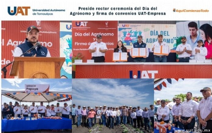 Cd. Mante, Tam.; 22 de febrero de 2023.- El C.P. Guillermo Mendoza Cavazos, rector de la Universidad Autónoma de Tamaulipas (UAT), presidió en el campo experimental La Posta, de la Unidad Académica Multidisciplinaria Mante (UAM Mante), la ceremonia conmemorativa universitaria por el Día del Agrónomo y la firma de convenios Universidad-Empresa con organismos del sector productivo del sur de Tamaulipas.