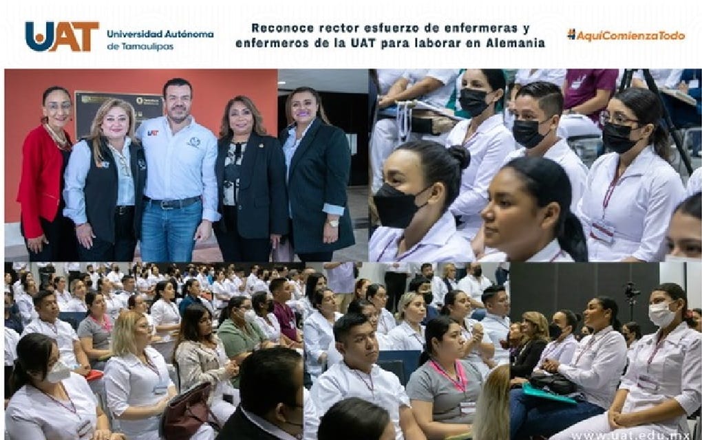 Ciudad Victoria, Tam.; 27 de marzo de 2023.- El C. P. Guillermo Mendoza Cavazos, rector de la Universidad Autónoma de Tamaulipas (UAT), reconoció el esfuerzo de egresados de la Licenciatura de Enfermería de esta casa de estudios, quienes, luego de concluir su formación en la UAT, participan para trabajar en Alemania.