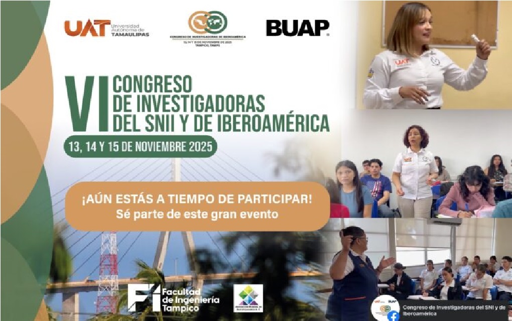 La Universidad Autónoma de Tamaulipas (UAT), en colaboración con la Benemérita Universidad Autónoma de Puebla (BUAP) y el Consejo Tamaulipeco de Ciencia y Tecnología (COTACYT), convocan al VI Congreso de Investigadoras del Sistema Nacional de Investigadoras e Investigadores (SNII) y de Iberoamérica 2025, que tendrá lugar del 13 al 15 de noviembre en la Facultad de Ingeniería Tampico.