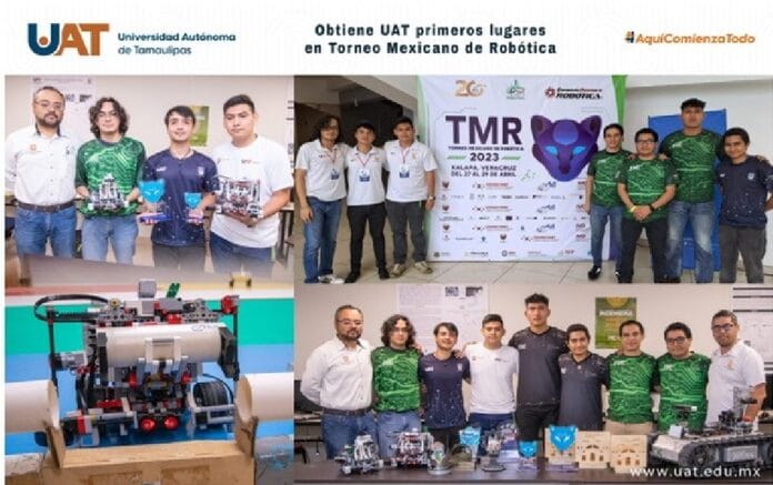 Ciudad Victoria, Tam.; 2 de mayo de 2023.- Alumnos de la Universidad Autónoma de Tamaulipas (UAT) tuvieron una destacada participación en el XIV Torneo Mexicano de Robótica 2023 realizado en Xalapa, Veracruz, donde obtuvieron primer y tercer lugar en dos de las categorías del certamen, una de las cuales otorga el pase al torneo latinoamericano a celebrarse en Brasil.