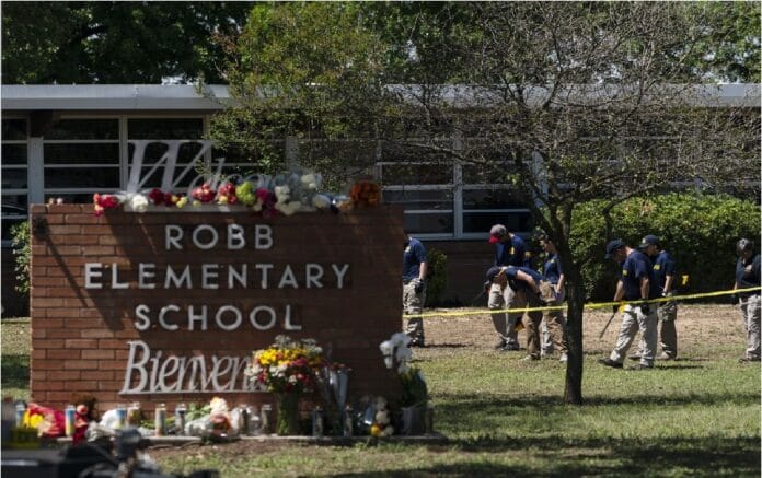 Los oficiales estaban estacionados afuera de la Escuela Primaria Robb el miércoles en Uvalde, Texas, donde ocurrió un tiroteo masivo el día anterior.