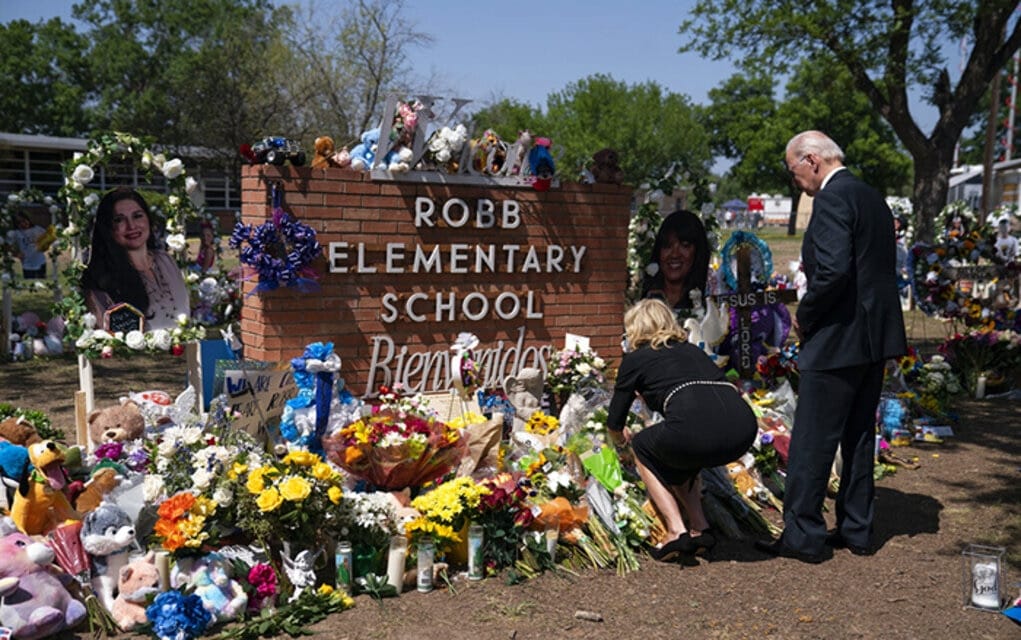 Afuera de la escuela primaria Robb, Biden se detuvo en el sitio de homenaje improvisado —con 21 cruces, una por cada víctima— y la primera dama añadió un ramo de flores blancas a una pila frente al letrero de la escuela. Vieron los monumentos colocados en memoria de cada estudiante y la primera dama tocó las fotografías de los niños mientras caminaban por el sitio.