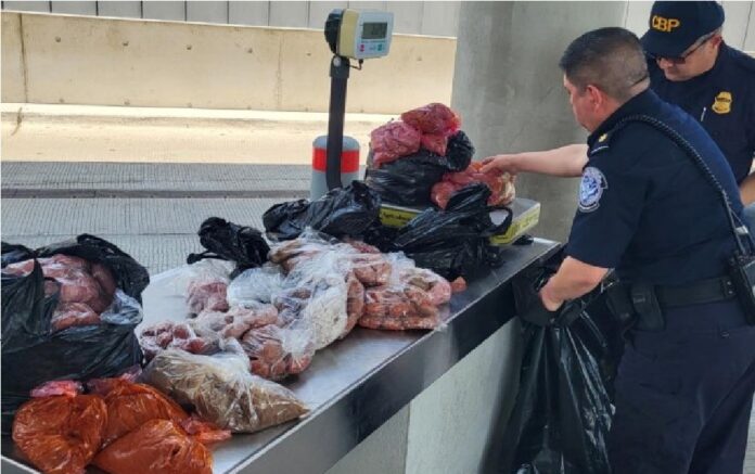 Laredo, Tx.– Oficiales de Aduanas y Protección Fronteriza de Estados Unidos y especialistas en agricultura descubrieron casi 125 libras de productos porcinos prohibidos en una sola acción policial en el Puente Juárez-Lincoln.