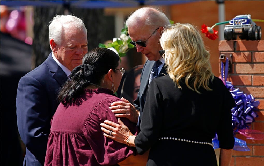 ARCHIVO - El presidente Joe Biden y la primera dama Jill Biden consuelan a la directora Mandy Gutierrez mientras el supervisor escolar Hal Harrell los observa, en la ofrenda frente a la Escuela Primaria Robb para honrar a las víctimas de una balacera, el 29 de mayo de 2022, en Uvalde, Texas. (AP Foto/Darío López-Mills, archivo)