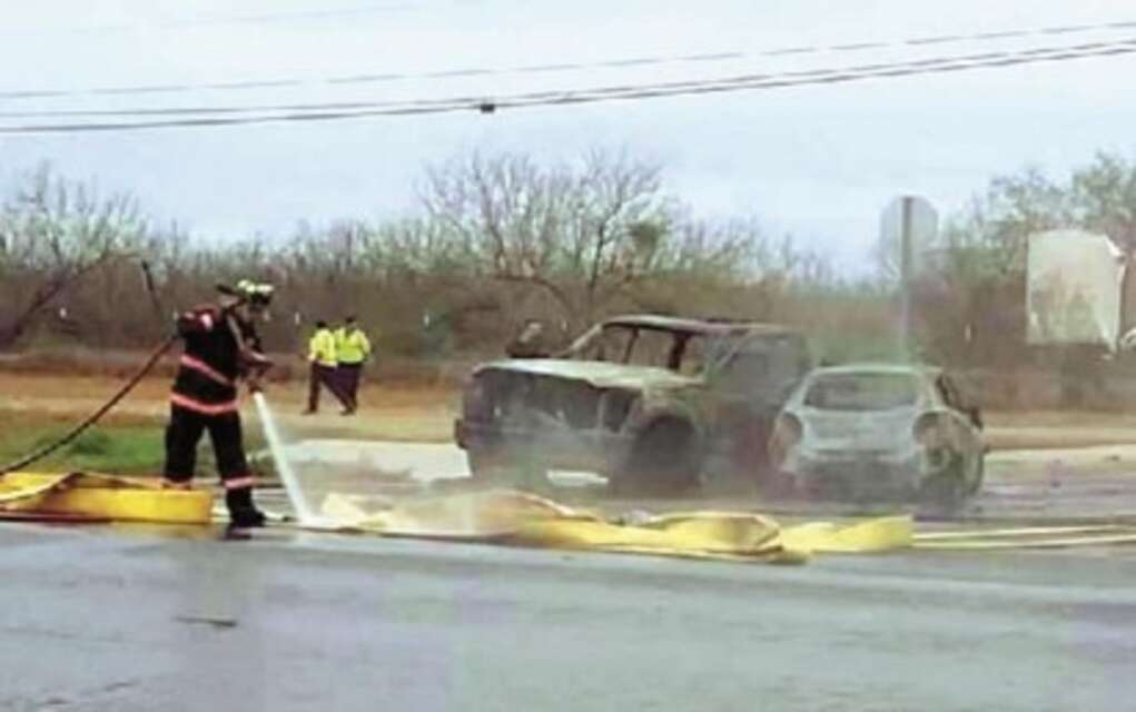 Laredo, Tx.-Ocupantes de dos vehículos, impactados por una colisión fueron sacados de entre las llamas, tras un accidente registrado ayer por la mañana en la carretera a Zapata, de donde tres empleados municipales fueron transportados estables a un hospital, con dolores en espalda y cuello.