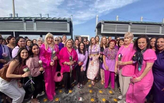 Laredo, Tx.- Por primera vez, el puente internacional 1 se vistió esta mañana de rosa y púrpura cuando centenas de mujeres de ambos lados de la frontera se unieron en la guardarraya para demostrar lazos de unión, fraternidad, fortaleza y entendimiento mutuo con flores que intercambiaron dentro del marco del Día Internacional de la Mujer.
