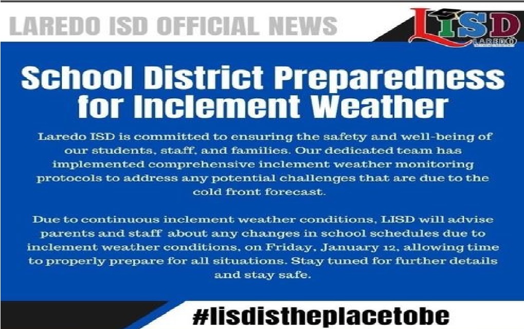 Por lo tanto, LISD continuará monitoreando las condiciones climáticas y trabajará con el Equipo de Manejo de Emergencias de la Ciudad de Laredo para abordar cualquier cambio.