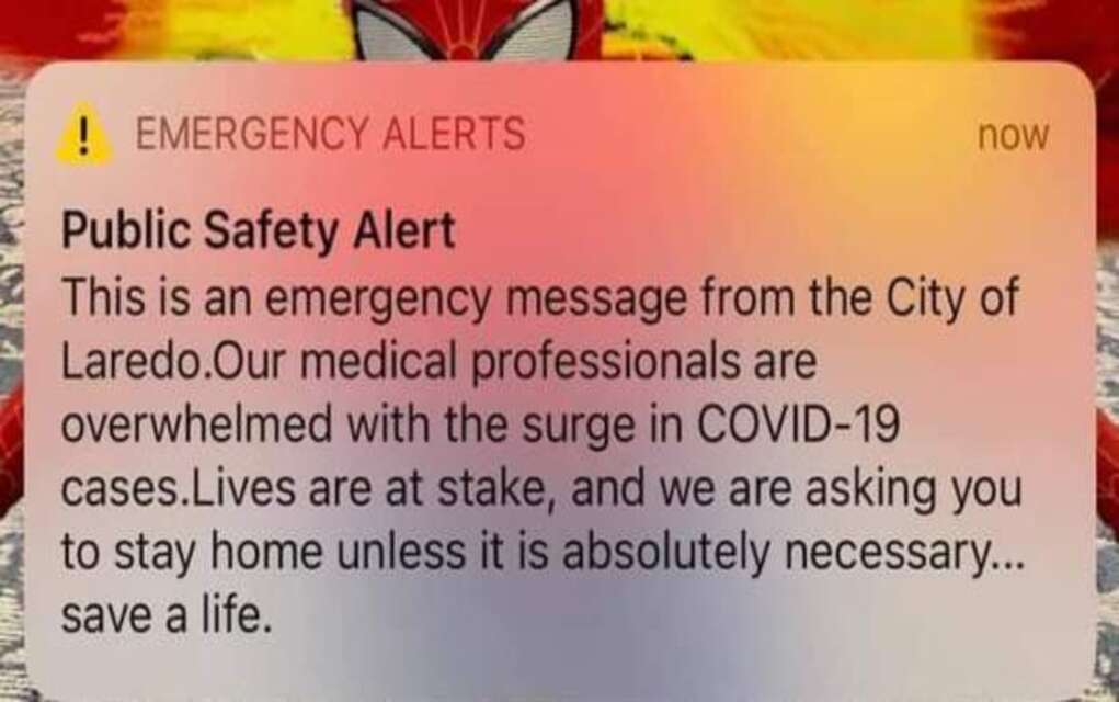 “Este es un mensaje de emergencia de la Ciudad de Laredo… Nuestros profesionales de la salud se encuentran sobresaturados con el incremento de casos de COVID-19… Muchas vidas se han perdido, y les pedimos que se queden en casa, al menos que sea absolutamente necesario…. salva una vida…”, dice el mensaje que llegó a la ciudadanía.