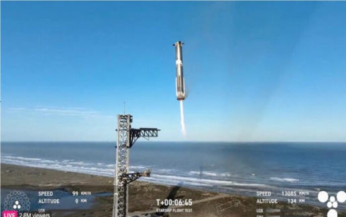 Durante el descenso del propulsor del megacohete fue atrapado por los brazos mecánicos denominados «palillos» instalados en su torre de lanzamiento, una hazaña de ingeniería lograda por primera vez en octubre.