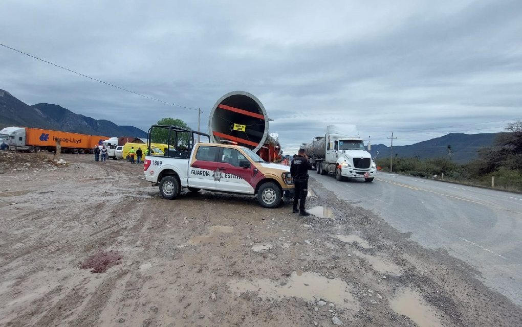 Personal de la Guardia Estatal de Apoyo Carretero asignado a la Estación Segura Tula se encuentra en el área brindado seguridad vial en este traslado cuyo destino final es la refinería de Tula, Hidalgo.