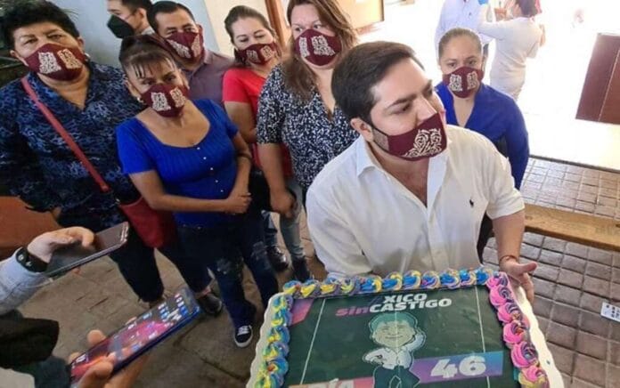 “Hoy venimos con este pastel para festejar que llevamos 46 días de impunidad del ex edil Xicoténcatl González Uresti que en estos momentos en lugar de estar siendo enjuicia, goza de un sueldaso en la SST” asevero.