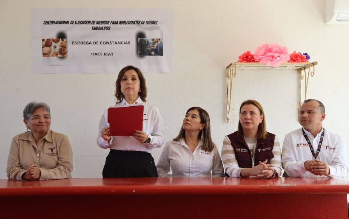 La ceremonia de entrega de constancias se realizó en el Centro Regional de Ejecución de Medidas para Adolescentes del municipio de Güémez y contó con la presencia de la directora general del ITACE, Claudia Anaya Alvarado.