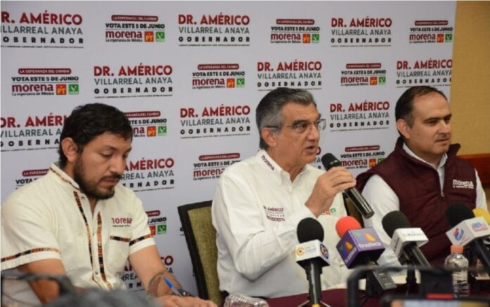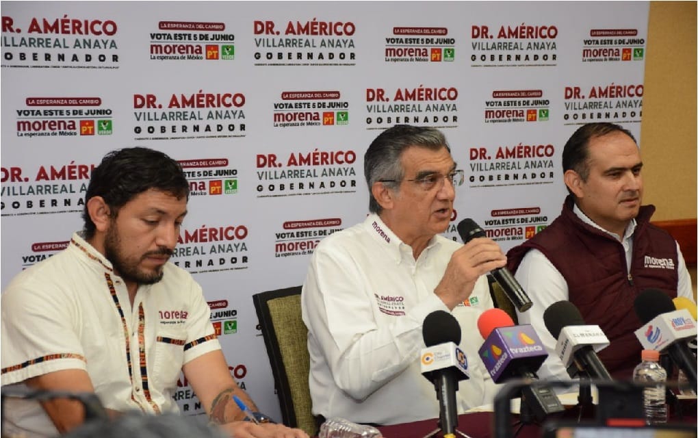 Américo Villarreal, con la presencia del Delegado Ernesto Palacios y del Secretario de comunicación del CEN de MORENA, Diego Hernández, reprobaron la estrategia panista y del gobierno de Tamaulipas de organizar bingos y otras actividades para limitar la asistencia a actos de campaña de Morena, por lo que habrán de presentar la queja correspondiente ante la instancia electoral.