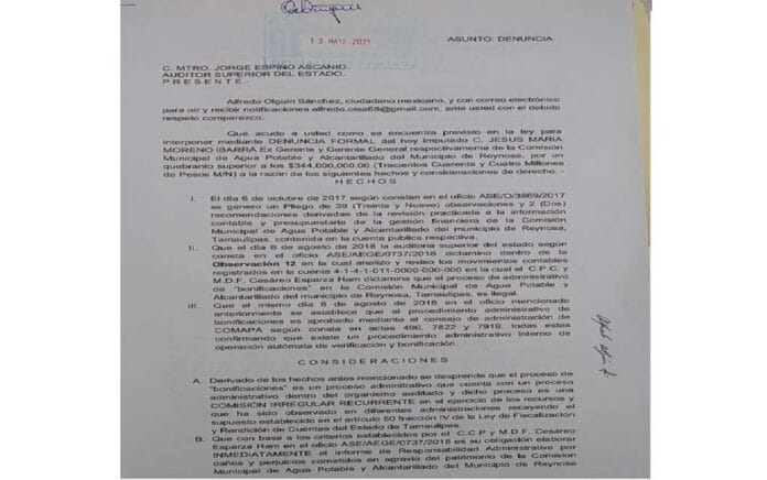 La denuncia Olguín Sánchez, la basó en el oficio ASE/O/2869/208 en donde dice se generó un pliego de 39 observaciones y dos recomendaciones derivadas de la revisión practicada a la información contable y presupuestaria de la gestión financiera de la Comapa de Reynosa contenida en la Cuenta pública respectiva.