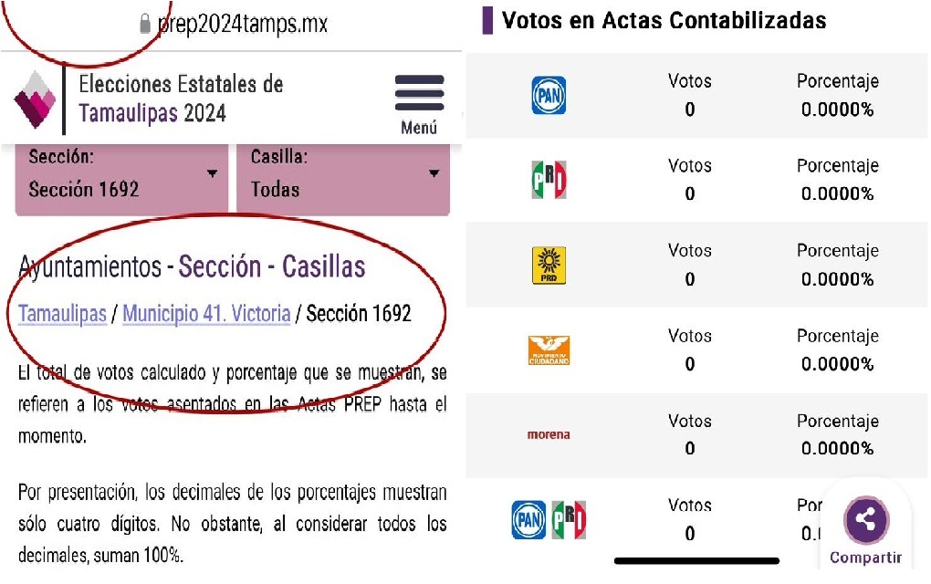 En lo que refiere al PREP, dieron a conocer varias secciones en donde la contabilidad aparece en cero por ciento de votos capturados, mientras que, en los resultados de las actas y las casillas, si se cuenta con registro de votos, en donde aparece con ligera ventaja Gattás Báez.