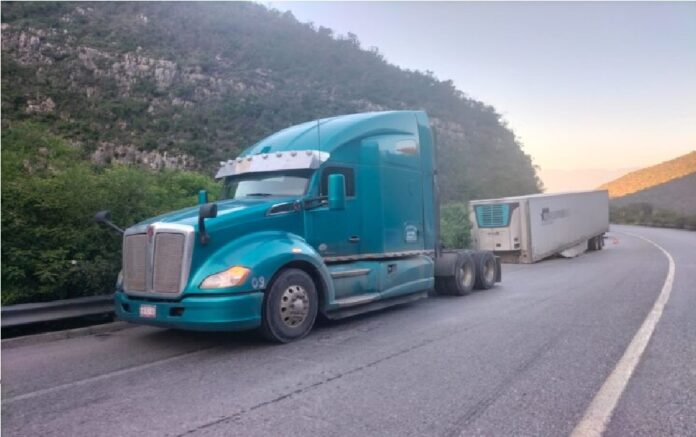 CIUDAD VICTORIA, TAMAULIPAS. – La circulación vehicular sobre la Carretera Rumbo Nuevo se encuentra parcialmente suspendida en el carril de sur a norte, por el desprendimiento de un remolque en el kilómetro 29+20.