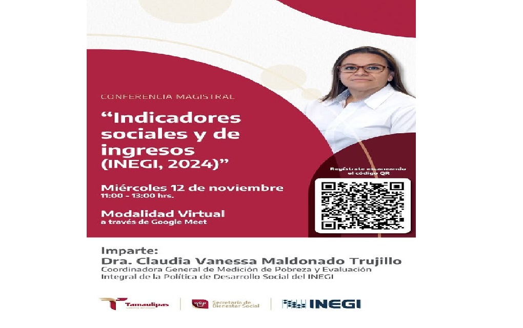 Ciudad Victoria, Tamps.-La videoconferencia magistral “Indicadores Sociales y de Ingresos (INEGI, 2024)”, será dictada por la Dra. Claudia Vanessa Maldonado Trujillo, coordinadora general de Medición de Pobreza y Evaluación Integral de la Política de Desarrollo Social del INEGI, el próximo miércoles 12 de noviembre, informó la secretaria de Bienestar Social Silvia Casas González.