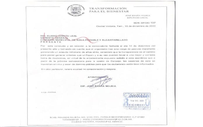 El representante del Congreso del Estado de Tamaulipas en el Consejo de Administración de la COMAPA Victoria solicitó mediante un oficio la solicitud para que a la brevedad posible las sesiones de dicho consejo se trasmitan en vivo para que la ciudadanía esté informada.