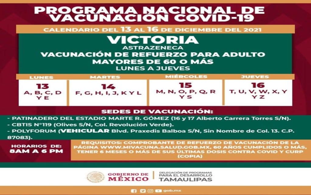 Ciudad Victoria.- Hoy inicia en la capital de Tamaulipas el programa de vacunación anti-Covid-19 tercera dosis para adultos mayores de 60 años y su aplicación será en orden alfabético en los módulos “El Patinadero” y CBTIS 119. En el estacionamiento del Polyforum operará el módulo vehicular.