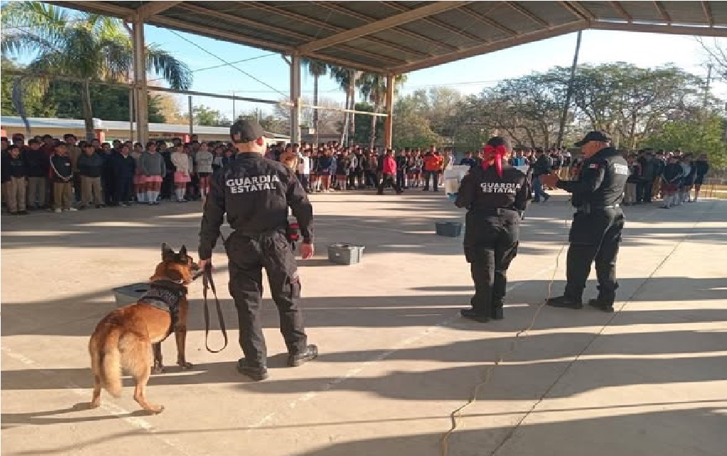 Ciudad Victoria, Tamaulipas.- Como parte de las acciones de prevención del delito y fortalecimiento de la seguridad en entornos escolares, personal del Agrupamiento Canino de la Guardia Estatal llevó a cabo una jornada cultural en la Escuela Secundaria Técnica “Magdaleno Aguilar Castillo”, ubicada en la colonia ejido La Presita.