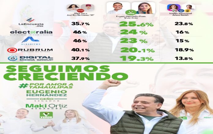 Ciudad Victoria.- La fórmula del Partido Verde al Senado de la República, conformada por Eugenio “Geño” Hernández Flores y Maki Ortiz Domínguez, sigue consolidándose en las preferencias electorales con rumbo a las elecciones del 2 de junio, pues registran una ventaja importante en comparación con la coalición opositora del PAN-PRI.