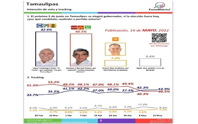 Un sonde demoscópico realizado por la casa encuestadora FactoMétrica lo apuntala con un 42.9 por ciento de las preferencias electorales de los tamaulipecos, seguido del candidato de Morena con un 40.5, los indecisos representan un 9.4 por ciento mientras que en último lugar aparece el representante de Movimiento Ciudadano con el 7.2 por ciento.