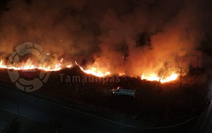 Ciudad Victoria, Tamaulipas.-Personal de Bomberos y Protección Civil Estatal, logró controlar el fuerte incendio que se registró esta noche en un predio ubicado entre la calle prolongación Carlos Adrián Avilés con cruce de carretera a Soto la Marina.
