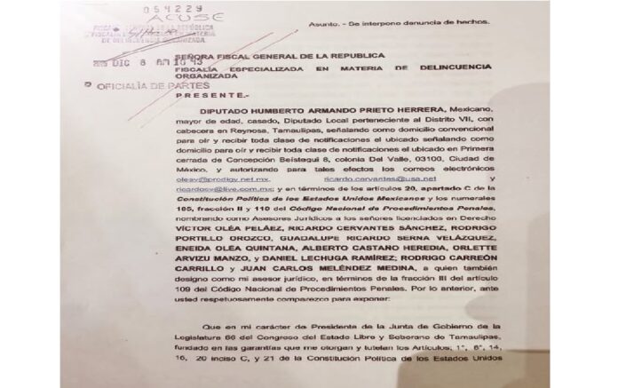 En la Fiscalía General de la República (FGR), el diputado federal Sergio Gutiérrez Luna y el presidente del Congreso de Tamaulipas, Humberto Prieto Herrera presentaron una nueva denuncia contra el ex gobernador Francisco Javier García Cabeza de Vaca por su presunta participación en el operativo de Huachicoloeo Fiscal.