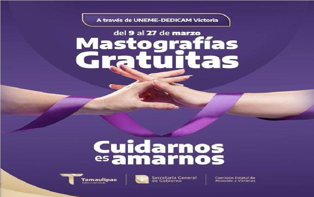 Ciudad Victoria, Tamaulipas.- La Comisión Estatal de Atención a Víctimas de Tamaulipas (CEAV Tamaulipas), mediante la unidad móvil de la UNEME-DEDICAM Victoria, convoca a la población a sumarse a la Jornada de Mastografías Gratuitas, que se realizará del 9 al 13 de marzo, en un horario de 9:00 a 15:00 horas, en sus oficinas centrales ubicadas en Calle Benito Juárez 214, Zona Centro, en Ciudad Victoria, Tamaulipas.