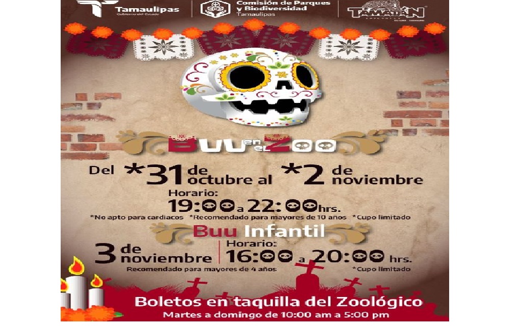 Ciudad Victoria, Tamaulipas. – Del 31 de octubre al 3 de noviembre llega uno de los espectáculos esperados en la capital de Tamaulipas: ¡Buu en el Zoo!, el cual se realiza en el Zoológico Tamatán, donde los sonidos de la fauna y sus sombras añadirán un toque especial en un recorrido nocturno espectacular.