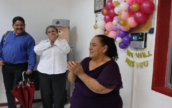 Ciudad Victoria, Tamaulipas.- Tras 34 años de servicio en la Secretaría de Seguridad Pública de Tamaulipas (SSPT), María Raquel Uvalle De la Cruz registró por última vez su salida como empleada de esta dependencia, concluyendo su jornada laboral con los abrazos de sus compañeras y compañeros, quienes le dedicaron una serenata con mariachi.