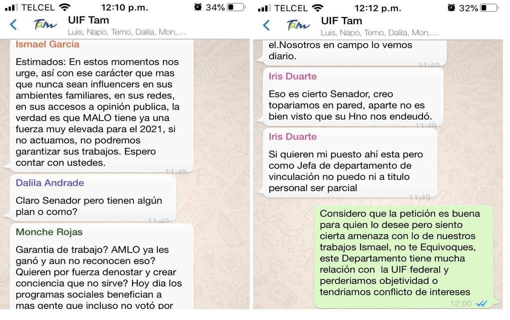 Circula en redes sociales una serie de capturas de pantallas de una presunta conversación en un grupo de -la aplicación de mensajería móvil- Whatsapp en la que un usuario etiquetado como Ismael García Cabeza de Vaca, senador y hermano del gobernador, condiciona el trabajo de empleados de la Unidad de Inteligencia Financiera de Tamaulipas para que estos se pronunciaran en contra de la figura de AMLO.