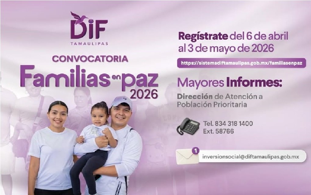 Ciudad Victoria, Tamaulipas.– Con la finalidad de incidir en el bienestar y el desarrollo de la población de atención prioritaria por medio de iniciativas de asistencia social, el Sistema DIF Tamaulipas, que preside la doctora María de Villarreal, invita a las organizaciones civiles donatarias a participar en la convocatoria “Familias en Paz 2026”, la cual contempla apoyo económico para la implementación de proyectos sociales.