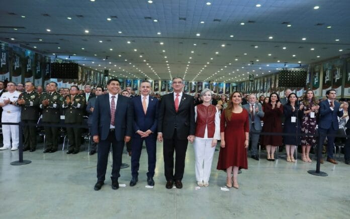 Acompañado por su esposa, la doctora María de Villarreal, presidenta del DIF Tamaulipas y de su familias, así como de los gobernadores de Quintana Roo, María Elena Lezama Espinosa y de Oaxaca, Salomón Jara Cruz, además de los integrantes de su gabinete, senadores, diputados federales y locales, presidentes municipales, mandos militares y representantes de todos los sectores productivos del Estado, Américo Villarreal valoró la extraordinaria relación con el presidente Andrés Manuel López Obrador y además reconoció la congruencia con los valores del humanismo mexicano.