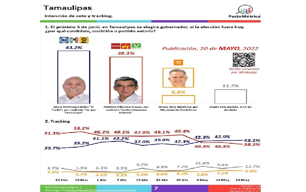 En la semana número siete de la campaña electoral, la encuestadora coloca a Truko de la Coalición “Va por Tamaulipas” en primer lugar con el 43.2 por ciento de la intención del voto, seguido de Américo Villarreal, de Morena con e 38.3 por ciento, en tercer lugar están los indecisos con el 11.7 y al final aparece Arturo Diez con el 6.8 por ciento.