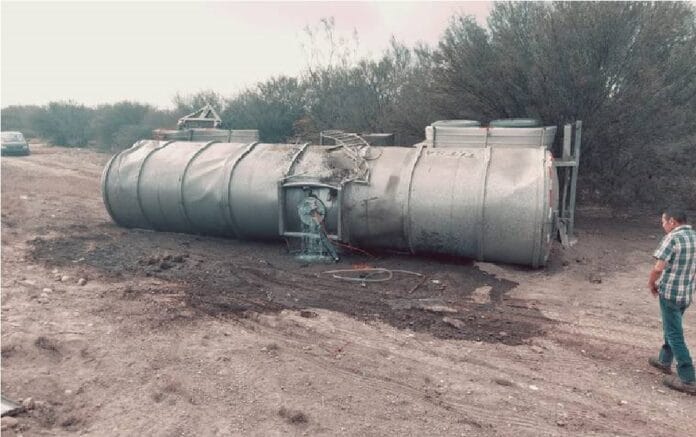 Padilla, Tamps.- Cuantiosos daños materiales fue el saldo de la volcadura de un tractocamión doble cisterna en la carretera Matamoros-Ciudad Victoria, resultando ileso su operador a pesar de lo aparatoso del accidente.