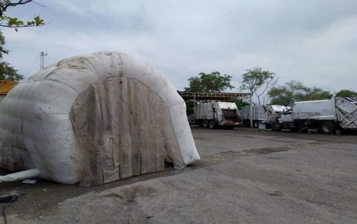 Ciudad Victoria.- El pasado tres de mayo el alcalde de Victoria Xicoténcatl González Uresti anuncio la instalación de un túnel sanitizante en el Campamento de Recolección de Basura, para que los 200 trabajadores que prestan este servicio, tengan un menor riesgo de contagio de Coronavirus (COVID-19), y así, contribuir a que disminuya la propagación.