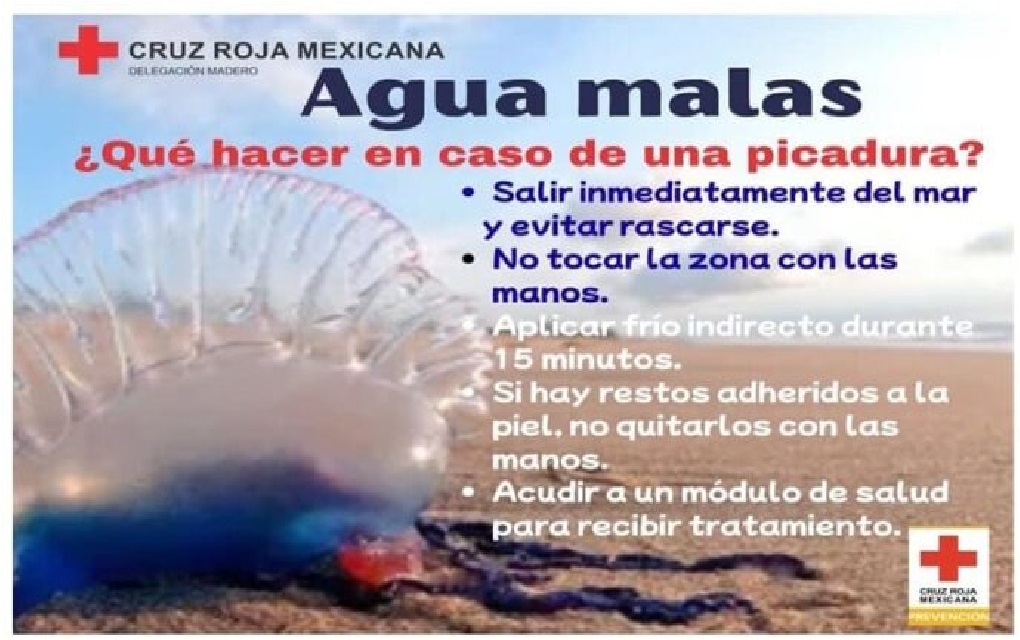 Ciudad Madero, Tamaulipas. – La Cruz Roja Mexicana Delegación Madero emitió un llamado a la población para extremar precauciones ante la presencia de medusas, conocidas comúnmente como “aguas malas”, en la Playa Miramar.