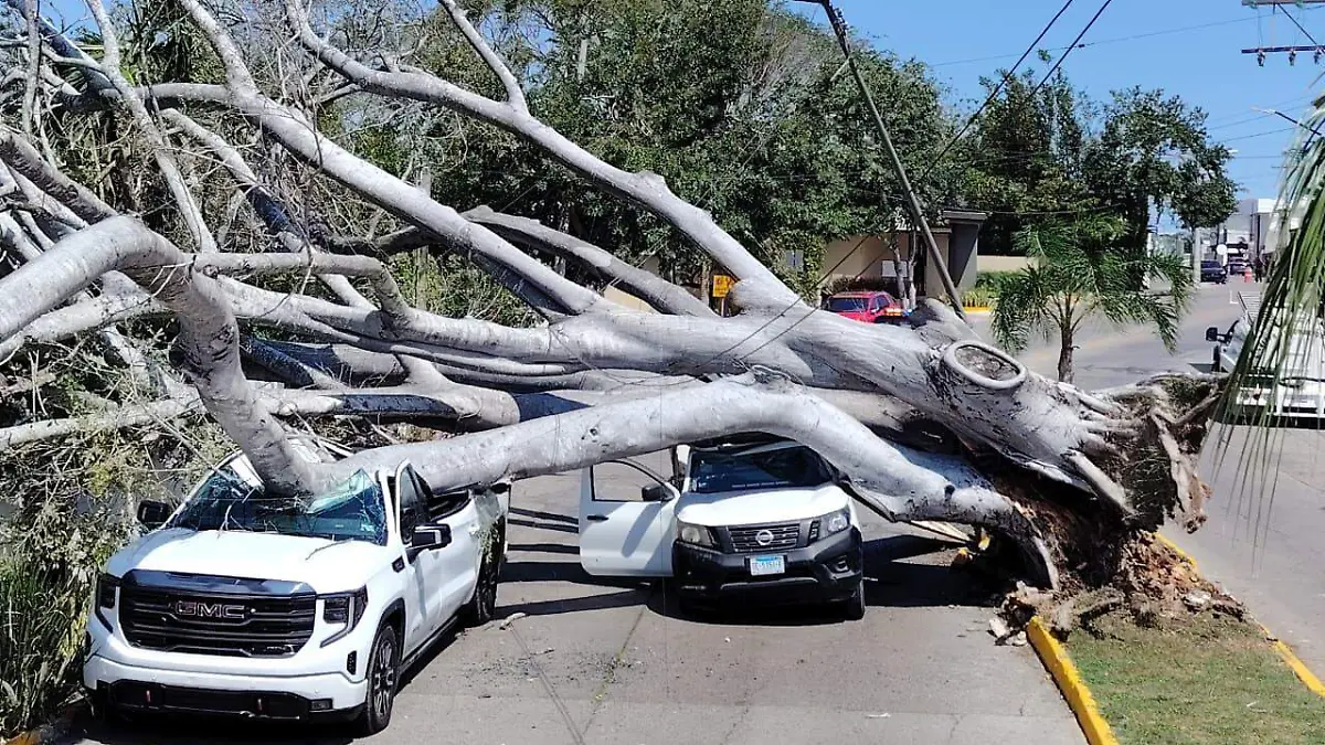 Tampico.- Las rachas de viento generadas por el frente frío 40 en la zona sur de Tamaulipas provocaron la caída de un enorme árbol este jueves en la colonia Lomas de Rosales, en el municipio de Tampico.