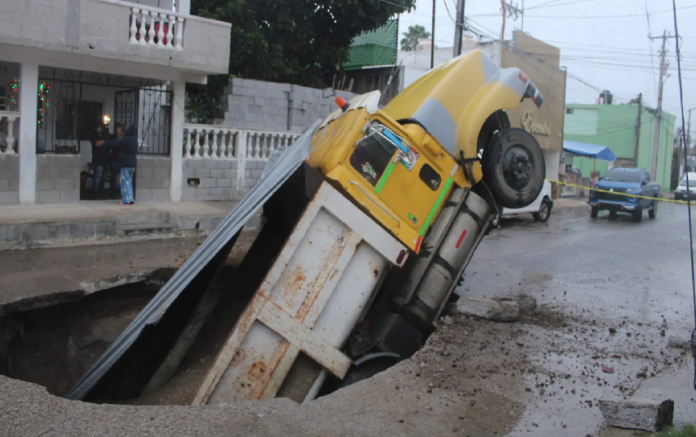 De acuerdo con los primeros informes, el conductor de la pesada unidad no pudo evitar el socavón, pero logró detenerse antes de caer completamente en él. Este percance alertó rápidamente a los vecinos del área, quienes dieron aviso a las autoridades para que se tomaran las medidas preventivas necesarias y evitaran mayores daños.