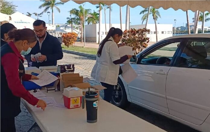 Tampico.- Decenas de familias acudieron desde muy temprana hora en sus vehículos y algunos a pie al drive thru instalado en el parque de la laguna del Carpintero de Tampico, en donde se aplican las vacunas contra la influenza estacional, Covid-19, VPH, tétano y otras enfermedades.