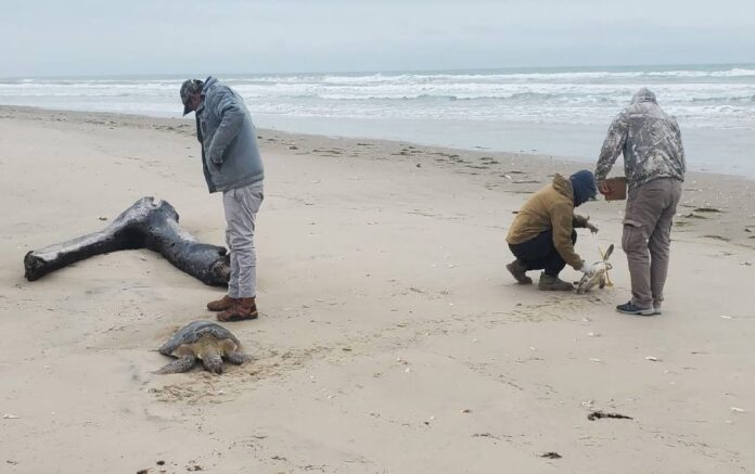 Soto La Marina, Tamaulipas.- Personal de la Comisión de Parques y Biodiversidad de Tamaulipas (CPBT) rescató 40 ejemplares tortuga verde (Chelonia mydas), que estaban varadas por las secuelas de la onda gélida que afecta al estado.