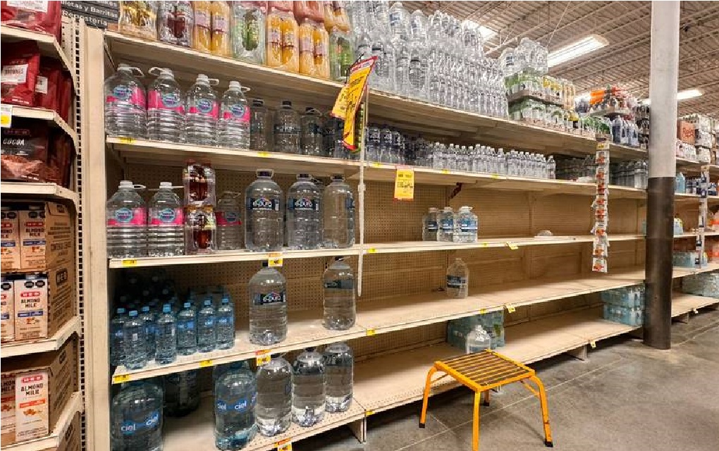 En dos supermercados de la zona, se observa que los consumidores comienzan a realizar compras de pánico al ver la disminución en los estantes de esta sección de productos esenciales, adquiriendo principalmente agua embotellada de 6 a 10 litros, así como paquetes de 24 botellas de 500 mililitros.