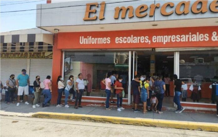 Altamira.- Al estar próximo el inicio del ciclo escolar 2022-2023, padres de familia realizan enorme fila en locales dedicados a la venta de uniformes escolares en el municipio de Altamira.